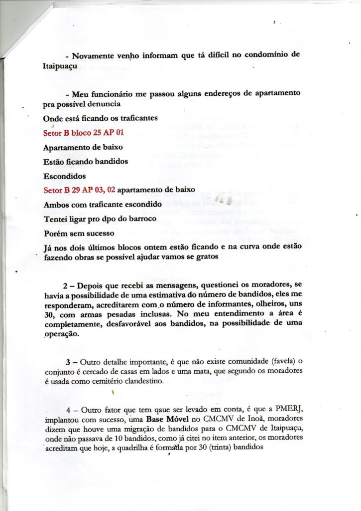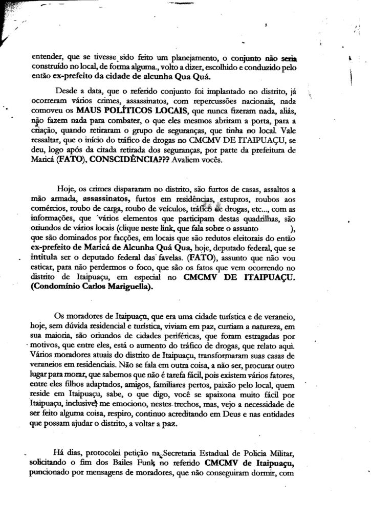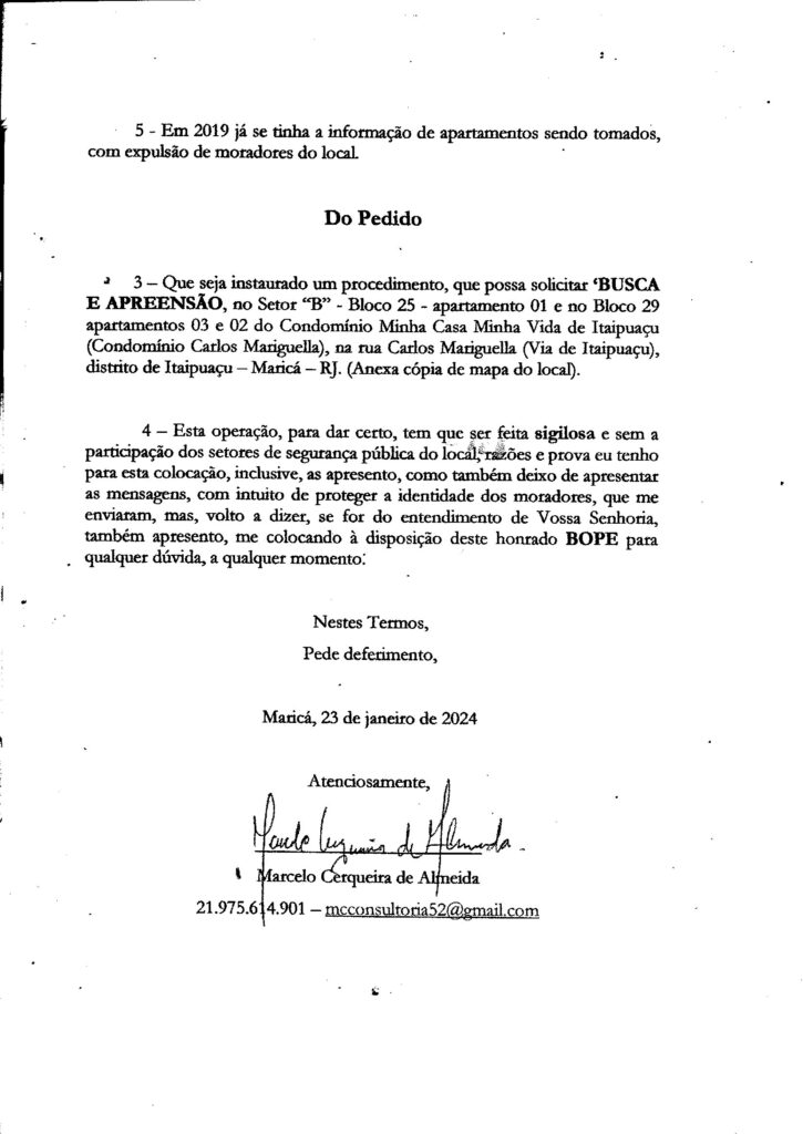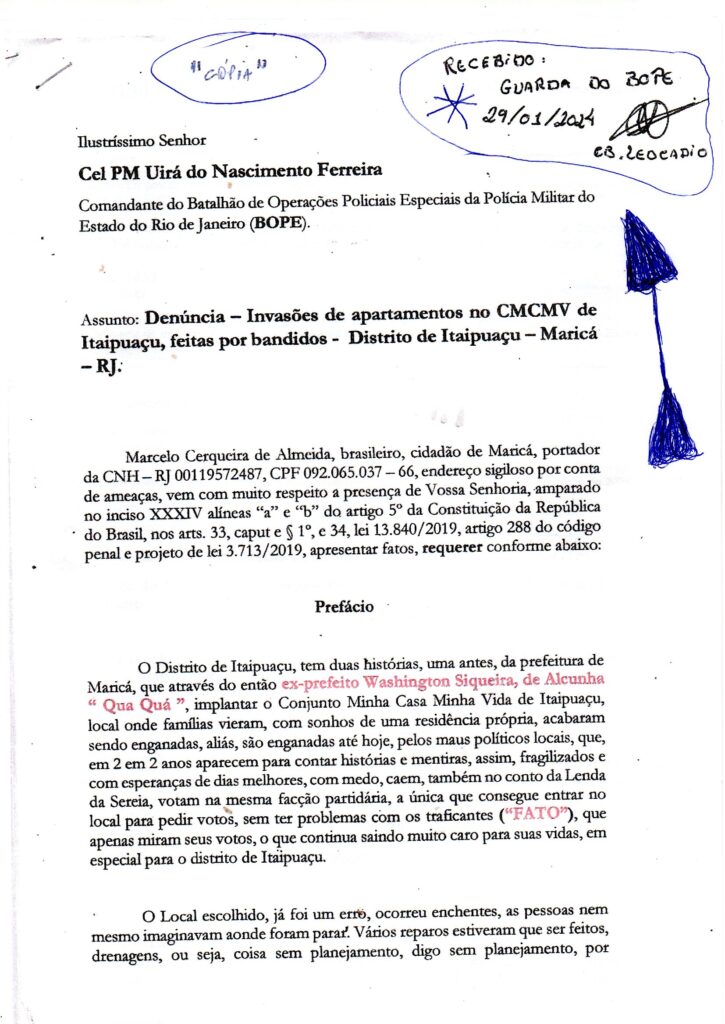 No dia 29 de janeiro de 2024, foi protocolado na sede do “BOPE” – Batalhão de Operações Policiais Especiais, petição com o mesmo conteúdo (Denúncia – Invasões de apartamentos no CMCMV de Itaipuaçu, feitas por bandidos – Distrito de Itaipuaçu – Maricá – RJ), que foi para as gavetas da 82ª DP (Centro de Maricá).