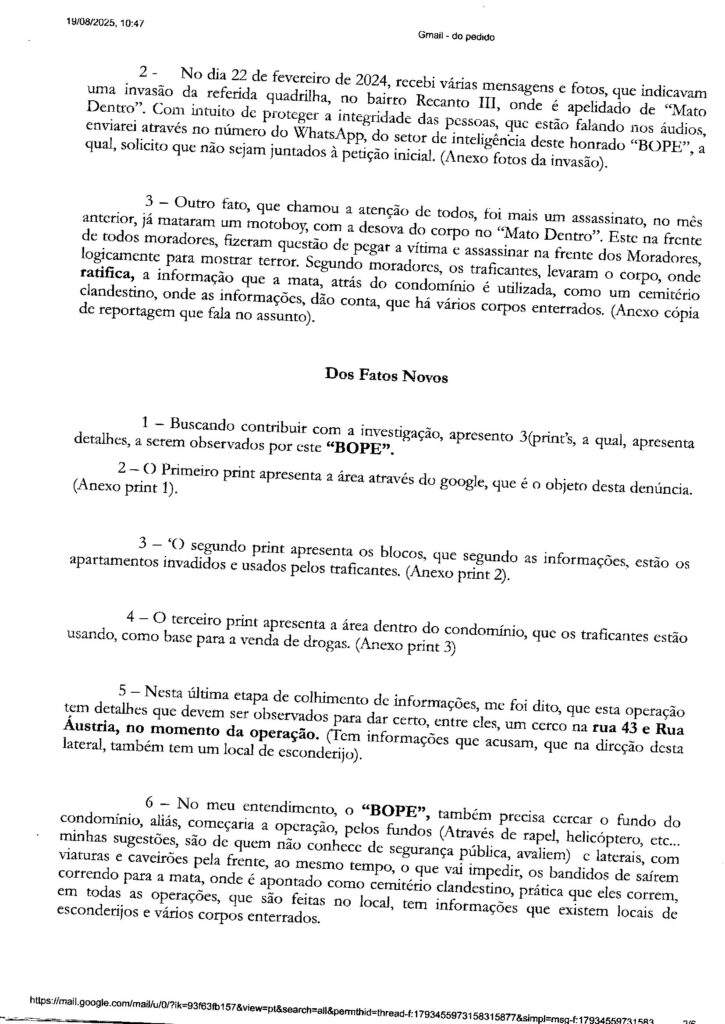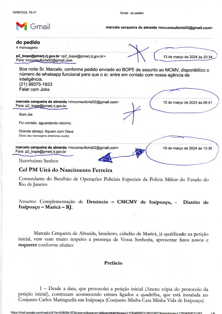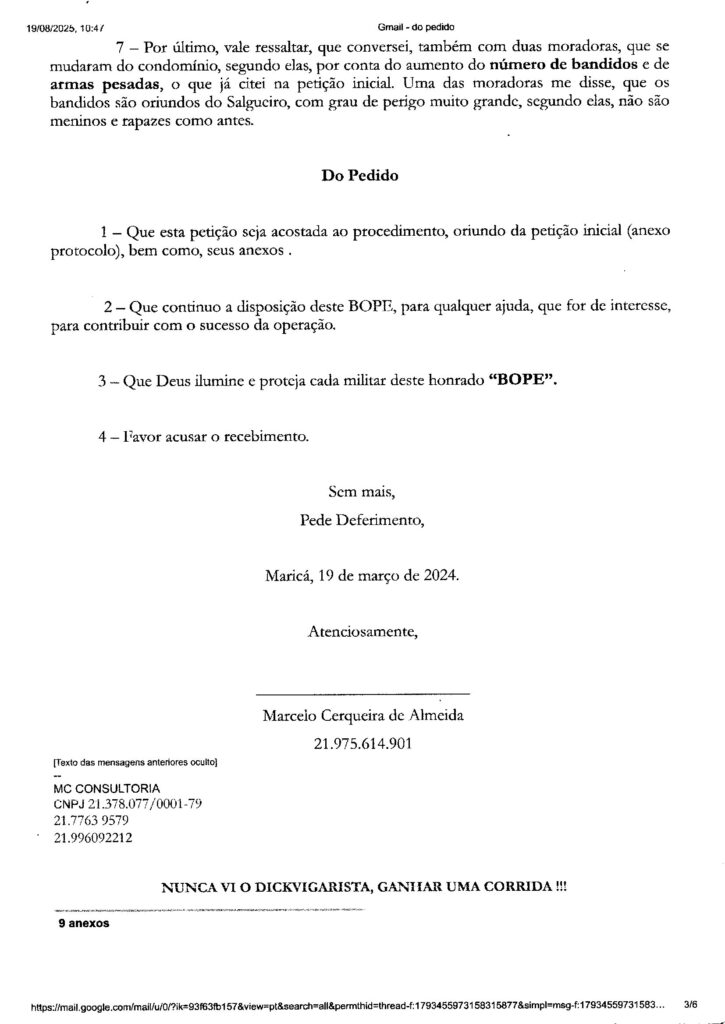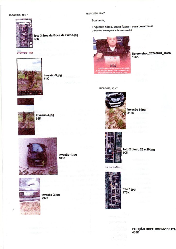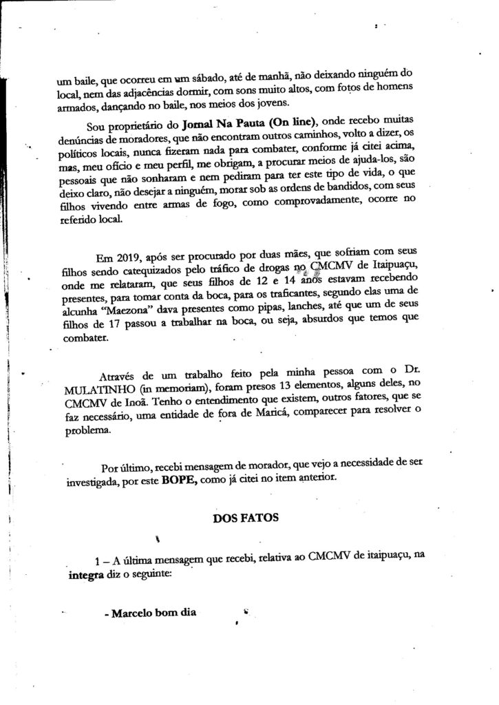 No dia 29 de janeiro de 2024, foi protocolado na sede do “BOPE” – Batalhão de Operações Policiais Especiais, petição com o mesmo conteúdo (Denúncia – Invasões de apartamentos no CMCMV de Itaipuaçu, feitas por bandidos – Distrito de Itaipuaçu – Maricá – RJ), que foi para as gavetas da 82ª DP (Centro de Maricá).